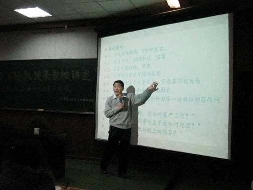 讲座伴随着同学们热烈的掌声开始,现场座无虚席,过道中也 站满了同学。王骚教授指出大学生要树立 “重学业、重素质、重能力”,“先就业、后择业、积极创业”的观念。 首先,王骚教授分析了高等教育大众化和当前金融危机下大学生就业面临的严峻形势和竞争现状。随后, 针对大学生关心的 就业、考研和报考公务员等问题,做了详细讲解。