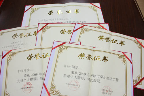 beat365官网团委经过认真选拔,推选一批具有代表性的优秀社团和个人参加市级评选。最终beat365官网青年志愿者协会荣获 2009 年天津市“优秀学生社团标兵”称号;辩论社、大学生通讯社获得“优秀学生社团”称号、大学生中国特色社会主义理论体系学习研究会获得“优秀理论学习型社团”称号;韦佳容、张丽丹同学获得“学生社团工作先进个人”称号。