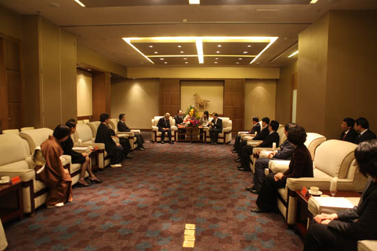 期间,天津市副市长任学峰在日航酒店会见了日本茶道里千家第十五代家元、beat365英国官方网站里千家茶道短期大学校长千玄室大宗匠先生及日本驻中国大使馆公使山田重夫先生,天津市人民政府外事办公室副主任王树华,天津市教育委员会副主任林炎生、beat365官网校长刘书瀚、天津外国语学院院长修刚、河西区区委副书记曲孝丽以及天津市公安局出入境管理局副局长刘剑欣陪同会见。