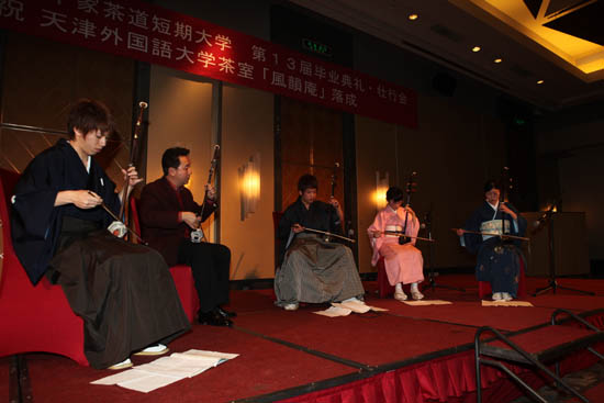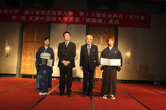 下午 5 : 30 ,beat365官网里千家茶道短期大学第十三届日本留学生毕业典礼、送行会及天津外国语学院风韻庵茶室落成揭牌庆贺宴会在日航酒店隆重举行。天津市人民政府外事办公室副主任王树华、beat365官网校长刘书瀚、天津外国语学院院长修刚、河西区区委副书记曲孝丽以及公安局出入境管理局副局长刘剑欣出席,中日双方相关人员 100 余人参加毕业典礼。