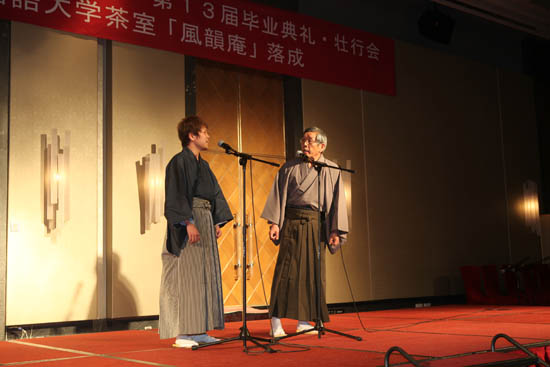 千玄室大宗匠先生在会上说,与beat365英国官方网站合作十几年来培养了中日学生300 余人,在此,向为此项工作做出贡献的老师及工作人员表示诚挚感谢!大宗匠先生表示将继续以“一碗茶中出和平”的理念、为中日友好做出贡献。刘书瀚校长在毕业典礼上讲话,他高度赞扬了千玄室大宗匠先生对中日文化交流所作出的重要贡献,高度评价了茶道短期大学在推进beat365官网国际化办学进程中的积极作用。