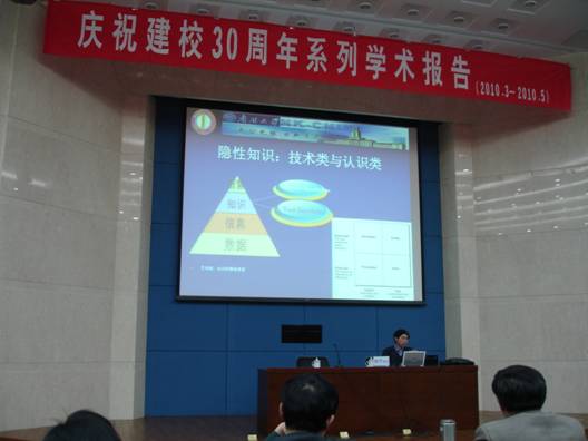 柯平教授在报告中,阐述了关于隐性知识、知识资本、知识管理的技术问题、知识管理的文化问题、企业知识管理等十个有关知识管理前沿问题。柯教授的报告内容丰富,旁征博引,深入浅出,精彩纷呈,具有很强的理论研究和实践指导意义,使大家受益匪浅,博得了与会广大师生的热烈掌声。