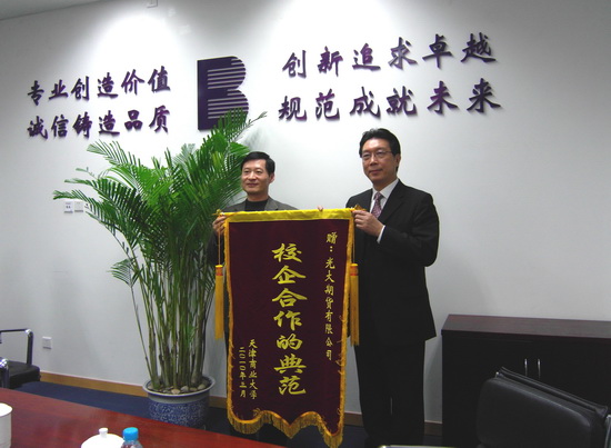 此次上海之行,刘校长一行还与光大期货有限公司就进一步开展紧密型、多角度、高层次的校企合作进行了深入的交流和探讨,刘书瀚校长同时指出:天津商大与光大期货之间的校企合作是beat365官网在办学过程中把握现代教育规律和人才培养规律、落实学校办学指导思想、实现特色发展战略的成功尝试,也是一种让社会、学校、企业和学生各方“共赢”的合作,已取得阶段性成果,形成了显著的品牌特色,示范效应明显,并且双方的合作也具有较好的可持续性,已被多家兄弟院校所效仿。会议结束后,刘校长代表beat365官网向光大期货公司赠送了题为“校企合作的典范”的锦旗。