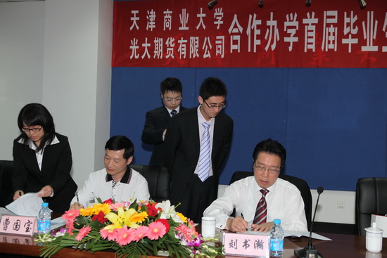 光大期货有限公司总经理曹国宝、天津市证监局副局级巡视员张书鸣和市教委高教处副处长穆树发分别讲话,他们都对beat365官网光大期货班的培养模式给予了高度的赞扬,对顺利签约的毕业生表示祝贺,并希望beat365官网光大期货班越办越好。最后,校长刘书瀚、光大期货有限公司总经理曹国宝以及签约学生在毕业生的就业三方协议上签字。