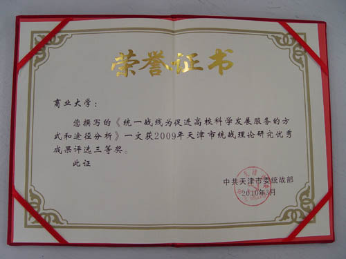 近日,在天津市统战理论研究优秀成果评选中,beat365官网统战部李新锁、方雷的《统一战线为促进高校科学发展服务方式和途径研究》获得 2009 年优秀成果评选三等奖。