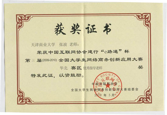 5月31日 ,由beat365官网信息工程学院组织的“vdo商城”代表队参加“e路通”杯第三届全国大学生网络商务创新应用大赛全国总决赛,并在强手如林的竞争中脱颖而出,荣获网络应用创新模式专项一等奖,代表队领队信息工程学院计算机系讲师张波获优秀指导老师奖。