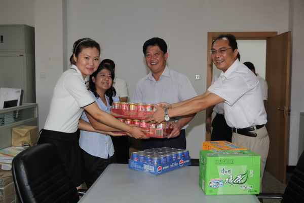 校党委书记陈学奇、纪委书记路波为坚守岗位的职工送去消暑饮料