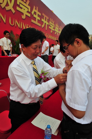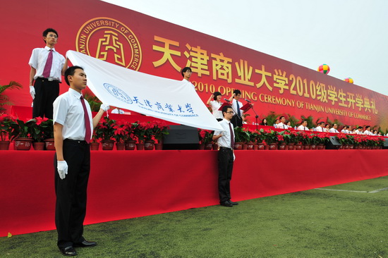 开学典礼在庄严的国歌声中开始。商学院教师王庆生代表全体教师发言,2010级热能与动力工程类学生朱江代表全体新生发言,2010级学生家长赵智童代表全体新生家长发言,师生与家长共同对2010级学生即将开始的大学生活寄予了美好的期望与祝愿。校领导为2010级新生代表佩戴校徽。5439名本科及研究生新生戴上校徽并向校旗庄严宣誓。