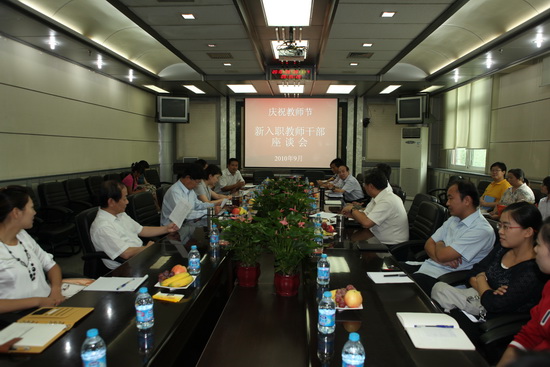 9 月 9 日上午,庆祝教师节——新入职教师干部座谈会在信息交流中心多功能会议室召开。党委书记陈学奇、副书记史习红、副校长魏胤亭、老教师代表和全体新入职教师干部共 30 余人欢聚一堂,共同庆祝第 26 个教师节。座谈会由人事处处长黄作良主持。