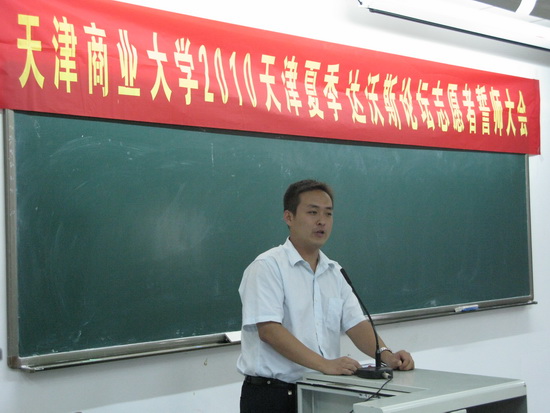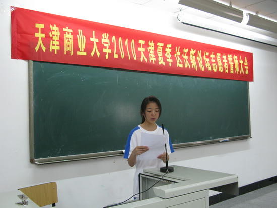 随后,志愿者代表07级金融专业张环宇同学上台发言,她表示,通过 严格的训练,志愿者们的服务水平有显著提高;志愿者们有信心在即将到任的岗位上尽心尽力,精益求精,用自己的辛劳和汗水确保工作任务圆满完成。