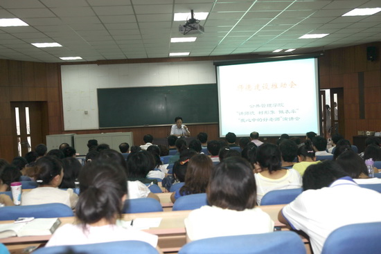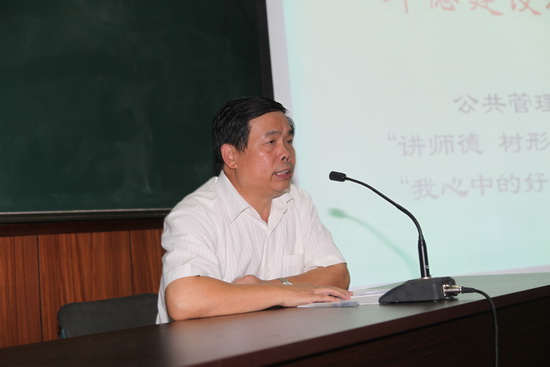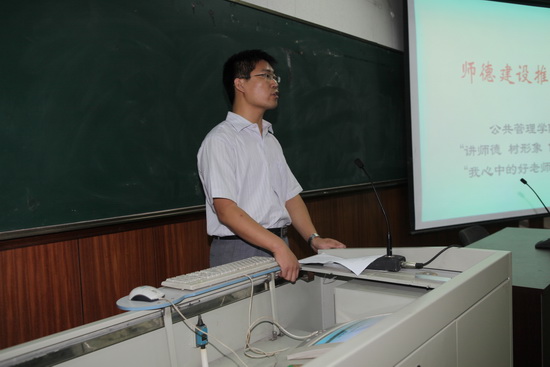 会上,公共管理学院党总支书记郑治中介绍了他们落实学校党政工作要点、加强师德建设方面开展的系列活动和取得的实效。公共管理学院的 6 位教师和两位学生以“讲师德、树形象、做表率”和“我心中的好老师”为题,分别进行了即兴演讲,阐述了他们对师德建设的认识与感悟,与会人员颇受启发。