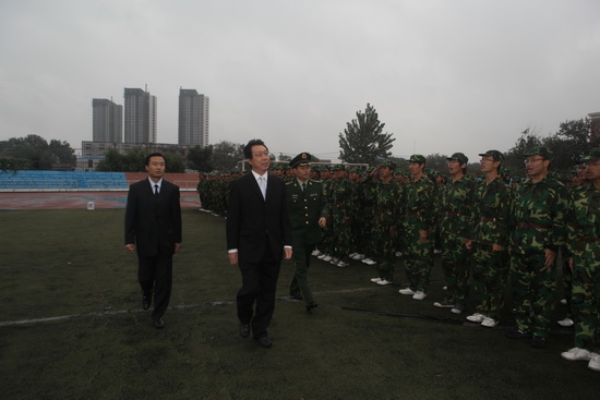 9月18日上午,2010级学生军训总结大会在校运动场举行。校长刘书瀚、校纪委书记路波,武警六支队一大队副大队长刘晓伟,教务处处长于义良,各学院党总支分管学生工作的书记、副书记出席了总结大会。大会由校武装部部长贾青主持,校长刘书瀚在刘晓伟和贾青的陪同下检阅了参加军训的2010级全体学生。