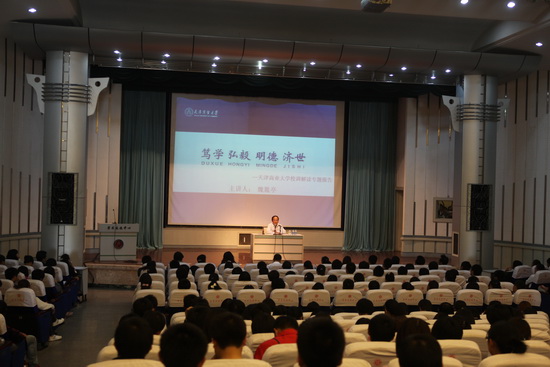9月29日下午,魏胤亭副校长为5367名2010级本科及研究生做专题报告,解读校训深刻内涵。此次校训解读专题报告会以学术交流中心为主会场,3 号教学楼、4 号教学楼为分会场共计37间多媒体教室同步视频直播。校纪委书记路波、学工部(处)全体老师,各学院分管学生工作书记、副书记,全体辅导员,全体2010级新生班主任参会听报告。