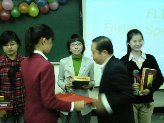 最后外国语学院王永祥副院长为本次活动做了精湛的点评,对参赛选手们的英语水平给予了充分的肯定。在欢快的乐曲声中,外国语学院田海龙院长、教务处曹军副处长等老师为获奖的选手们颁发了奖杯、证书和奖品。