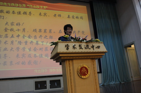 10月20日 下午,以 “天之骄子,树学术新风;商以富国,展创业宏图”为主题的 第七届“黄金学术月”在学术交流中心隆重开幕。校团委书记王罡、各学院团委书记以及兄弟院校代表南开大学学生会执行主席庄烁今出席了本次活动。