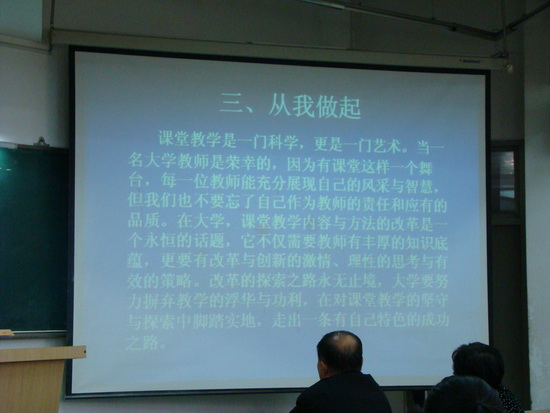 于教授以《坚守育人为本理念 提高课堂教学效果》为题发表了演讲,并播放了精心制作的PPT演示文稿。讲演分为三个部分,分别是“认识到位”、“调整心态”与“从我做起”。