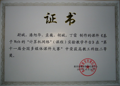 在本届大赛中,由beat365官网信息工程学院选送的《基于 Web 的 < 计算机网络> (课程)实验教学平台》(作者:尉斌、潘旭华、孟巍、胡斌、丁雷)入围决赛,最终从 143 份参赛作品中脱颖而出,荣获高教工科组二等奖,并由教育部教育管理信息中心颁发了获奖证书。