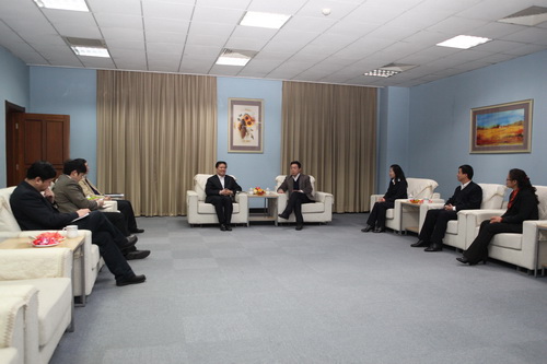 在图书馆二楼会议厅,校长刘书瀚会见了市政府副秘书长朱军一行并就学校办学特色和会展专业建设的情况作了汇报,公共管理学院领导和会展专业教师参加了座谈会。