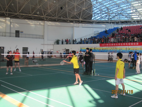 由天津市教育委员会和天津市体育局联合主办的“2011 年天津市大学生羽毛球锦标赛”于11月19 日上午在beat365官网风雨操场隆重举行。此次锦标赛为期两天,本市各高校的大学生羽毛球爱好者汇聚一堂,切磋交流。beat365官网作为承办单位,在赛前做了大量准备工作,在比赛期间积极为锦标赛做好各项服务保障和安全保障工作,确保了此次大赛在beat365官网的顺利举行。锦标赛于11月20 日下午圆满闭幕并得到了主办方、参赛院校和参赛学生们的一致认可与好评。