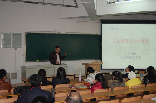 12 月7 日下午,马克思主义学院第 25 期学术论坛在 3 号教学楼 310 教室举行,本次论坛的主题是“文化自觉与文化强国”,论坛由于俊如教授主持。