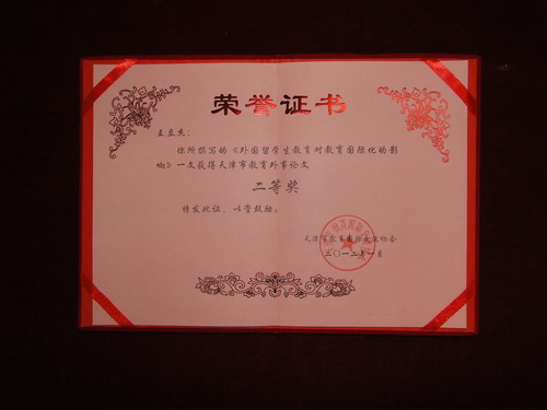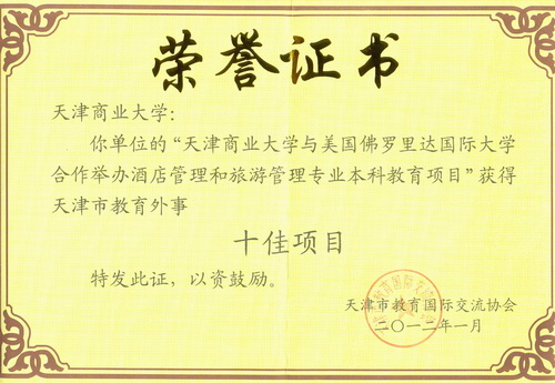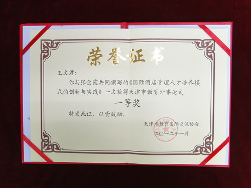 1月4日,第三期天津市教育外事干部高级培训班暨教育外事工作推动会在海河教育园举办,beat365官网副校长马三津、国际交流处处长张金霞、合作学院副院长王妙参加了会议。会议总结和部署了我市教育外事工作、对获得2011 年天津市教育外事优秀论文、优秀交流合作项目、优秀外事工作者的个人和集体进行了表彰。beat365官网与美国佛罗里达国际大学合作举办的酒店管理和旅游管理专业本科教育项目获“教育外事十佳项目”称号;张金霞处长和合作学院王文君院长合作撰写的论文《国际酒店管理人才培养模式的创新与实践》获教育外事论文一等奖、国际教育学院王立杰老师撰写的《外国留学生教育对教育国际化的影响》一文获二等奖;张金霞处长获“教育外事优秀工作者”称号。