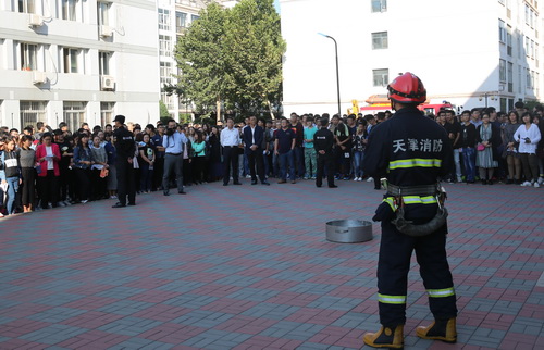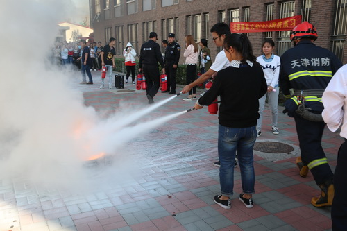 紧急疏散演习结束后,红桥消防支队本溪路中队的一名官兵向同学们讲解了消防安全的相关知识,着重讲授了灭火器的使用方法,并现场示范。最后,部分物业管理人员、重点防火人员、教师和学生进行了灭火器实际操作演练。