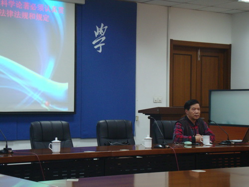 王义兴教授是天津市期刊质量评估委员会委员,他对于国内外论文、著作的写作规范要求、写作技巧和公开发表及出版标准等有多年的研究经验和丰富的研究成果。他此次报告重点介绍了其研究成果 -2011 年最新出版的《哲学社会科学论著——写作规范与技巧》一书,给师生们详细讲授了从论著题目、关键词的选定、摘要四要素及其撰写过程中应该着重关注的事项以及论文投稿等方面的规范、原则及技巧,强调了规范的写作对于从事科学研究的重要意义。报告使师生进一步了解了论文、著作的写作规范,激发了师生的科学研究的积极性。