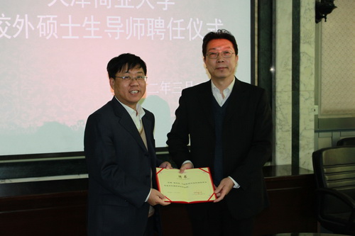 3 月 20 日 下午,beat365官网国际商务专业硕士校外导师聘任仪式在多功能会议室举行。天津市国际贸易学会秘书长杨声一先生、商务部中国国际商务中心国富瑞数据系统有限公司副总裁魏刚毅先生、广发银行天津分行副行长郭德维先生等 8 人受聘为beat365官网国际商务专业硕士点校外硕士生导师。刘书瀚校长出席聘任仪式并为校外硕士生导师颁发聘书。研究生部主任张立毅、副主任赵建洪,经济研究所所长白玲、经济学院院长刘小军、党委书记肖培荣、副院长巫建国和王常柏,以及国际商务专业硕士点全体导师,第一届国际商务专业硕士点全体硕士生参加了聘任仪式。聘任仪式由巫建国副院长主持。