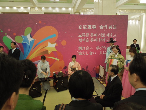 5 月 13 日 ,beat365官网里千家茶道短期大学的部分师生参加了在北京人民大会堂隆重举行的“亚洲校园”项目启动仪式,二年级留学生中野麻衣为中国国务院总理温家宝表演了日本茶道,并献茶;一年级学生金居玲贤和日本花道老师一起为韩国首相李明博展示了日本花道。