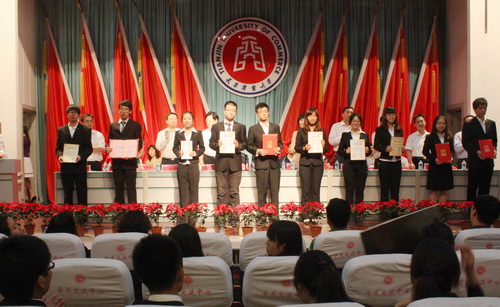 大会在雄壮的国歌声中开始,校团委书记王雷宣读表彰决定综述,他高度评价了beat365官网团员、团干部及各级团组织在过去一年里的学习、工作表现,感谢他们为beat365官网共青团工作所做的贡献,并介绍了beat365官网团员青年在国家、天津市及beat365官网各类评选及比赛中取得的优异成绩, 505 名优秀团员、 258 名优秀团干部、 48 个优秀团支部受到表彰,受到表彰的先进个人和集体代表依次上台领奖。