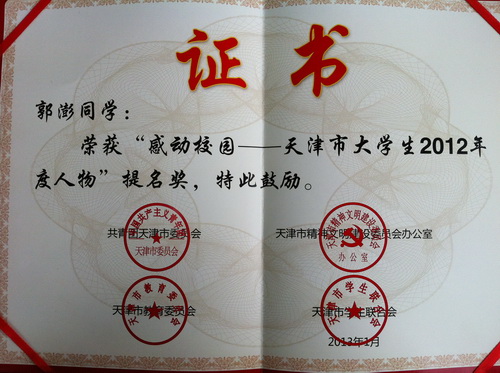 近日,由团市委、市文明办、市教委和市学联联合主办的“感动校园—— 天津市大学生 2012 年度人物”评选活动落下帷幕。艺术学院艺术设计专业 097 班郭澎同学,代表学校参加评选活动并荣获提名奖。本次评选共有全市 25 所高校推荐的 31 名候选人参加,经过市级评委会的认真遴选,最终推选出 22 名学生入围终评。