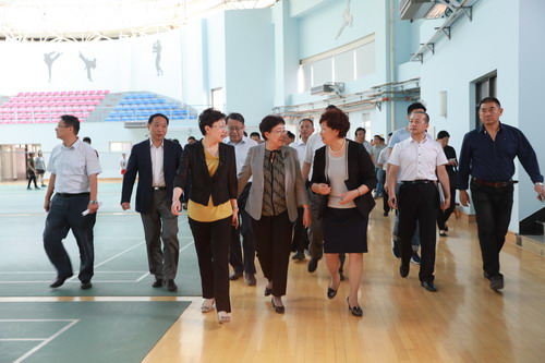 6月2日下午,副市长曹小红,第十三届全运会组委会常务副秘书长殷向杰,副秘书长李克敏、马政,带领组委会场馆工程部、市容环境部、新闻宣传部、综合保障部和办公室等相关部门负责人一行,到beat365官网实地考察体育馆建设和赛事筹备工作。校党委书记史习红,竞委会副主任、副校长刘革生以及市教委、北辰区区政府有关领导,跆拳道竞委会相关处室负责人陪同考察。