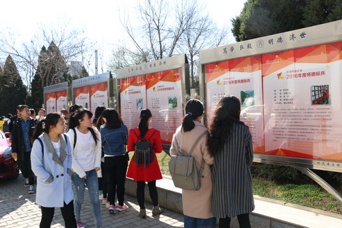 3月25日,“2016年度师德标兵”风采展在一号教学楼前宣传橱窗展出。