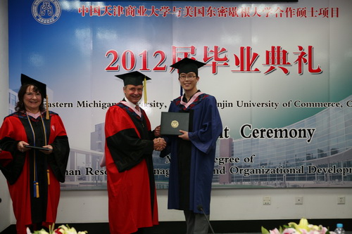 东密歇根大学商学院院长 David Mielke 博士在致辞中高度赞扬了中美两校之间的合作,同时也肯定了第六届学生所取得的骄人成绩并为学员颁发了学位证书。