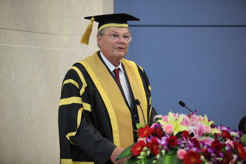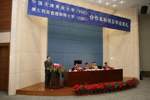 典礼首先由澳大利亚查尔斯特大学校长 Lawrence Willett 致辞,他表达了自己对 2012 届毕业生的良好祝愿,并希望两校的合作办学关系更加紧密。之后,副校长葛宝臻教授在典礼上讲话,他向远道而来的客人及学生家长表示了欢迎,并向获得澳方商务研究学士学位的同学们表示祝贺,同时鼓励大家抓住历史机遇,立志图强,并希望同学们心系师生情谊,关心母校发展。