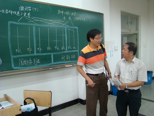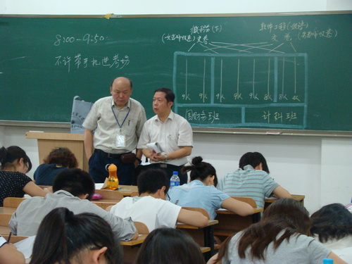 7月12日上午8点至9点50 ,在三教202 室,计科0802 班的《软件工程(双语)》与国财务 0801 班的《微积分(下)》同场考试,信息工程学院监考教师按照事先制定的“双卷双班考场”监考预案,在另外两位来自兄弟学院的监考教师的配合下,合理组织考场,顺利完成考试,准确收回试卷。在组织考场与考试过程中,学院 潘旭华副院长与王艳军副书记亲临现场进行指导。