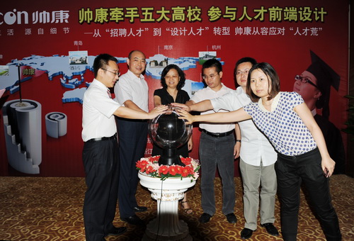 在江南杨梅飘香的季节,“中国 500 最具价值品牌”及中国厨卫电器行业第一品牌帅康集团( 2011 年品牌价值为 86.76 亿人民币)发起的“帅康牵手五大高校,参与人才前端设计”活动拉开了大幕。beat365官网与国内其他 4 所高校 —— 中国海洋大学、南京林业大学、浙江工业大学、浙江大学宁波理工学院一起参加了 6月30 日在“河姆渡文化遗址”所在地、帅康集团总部浙江余姚召开的新闻发布会,并在现场进行了共建大学生实习基地签约、授牌仪式。