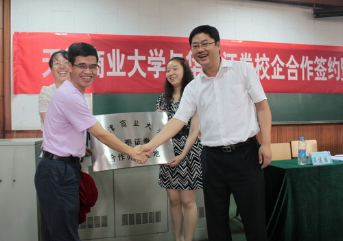 经济学院与华泰证券天津分公司校企合作签约暨揭牌仪式于 6 月 29 日隆重举行。教务处副处长曹军,经济学院院长刘小军,院党委书记肖培荣,副院长王常柏、巫建国及各系所领导,华泰证券天津分公司相关部门领导和营业部经理孙伟、王志刚、郭秀等出席了仪式。仪式由金融系主任刘红霞主持,金融系全体教师和大三、大四学生参加了仪式。