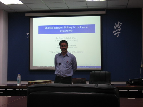 在理学院的邀请下, 6 月22 日~23 日,美国南卡罗来纳大学统计学系教授Dr. Edsel A. Pena (埃德塞尔 ` 潘纳 博士)对beat365官网进行了访问。