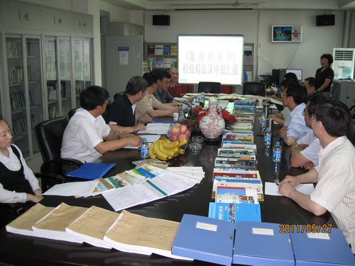 5月27 日,经过长期精心准备,经济学院《微观经济学》校级精品课建设授受校内外专家组验收。受beat365英国官方网站委托,以南开大学张彤玉教授为组长的专家组一行 5 人,对经济学院申报的《微观经济学》课程进行了入校考察。专家组听取了课程组的工作汇报,审阅了教学文件及教学资料,浏览了课程网络资源,进行了随堂听课,组织了学生和教师座谈会,听取了师生意见。通过考察,形成以下评审意见: