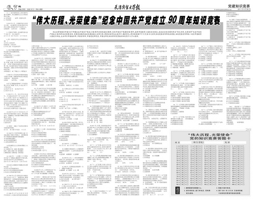 2011 年是中国共产党成立 90 周年,为贯彻落实校党委《关于开展庆祝中国共产党成立 90 周年活动的通知》精神,推动全校广大党员干部、师生员工认真学习党的历史和党的基本知识,校党委宣传部、组织部、团委在全校组织举办“伟大历程、光荣使命”庆祝中国共产党成立 90 周年知识竞赛活动。