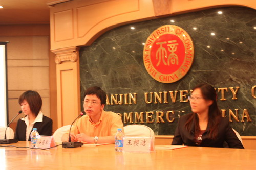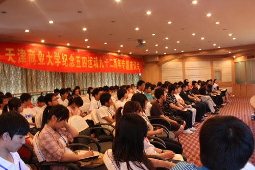 开场视频带领同学们回顾了五四运动的历史和共产党的发展历程。社研会指导老师安晋军和王樱洁为在五四征文活动及论文集封面设计比赛中获奖同学颁发了证书。社研会会长王天一发言,缅怀五四精神,强调了当代青年的历史使命。来自南开大学的代表发言,指出当代大学生应该理性爱国。同学们共同欣赏了在本届征文比赛中获得一等奖的论文《奏历史凯歌 续时代风流》,该文对五四精神的现代意义进行了深入讨论,明确了天商青年的奋斗目标。观众自由发言后,安晋军老师总结讲话,他肯定了同学们在论文写作中的深入思考,告诫同学们要理性爱国,正确对待社会中存在的问题,从自我做起,做合格的青年学子。