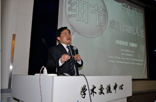 4月13日晚,由商学院学生工作办公室协同帅康集团主办,企业管理研究会(工商管理专业)承办的“细节决定人生—2011帅康集团客座教授全国高校巡讲”在学术交流中心隆重举行,近500 余名学生聆听了演讲。主讲人为刘春华博士,现任帅康集团常务副总裁,曾任海尔集团空调营销总监12年。