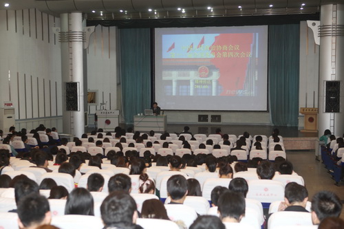 邱立成副校长从我国“人民代表大会制度”和“政治协商会议制度”两种政治制度的性质、内容及产生方式谈起,为师生们详细介绍了国家的政治体制及五年规划的重要意义。全面介绍了 2011 年“两会”的主要内容,总结概括了“十一五”期间我国经济建设取得的辉煌成绩,特别结合“两会”期间委员们的重点提案、社会民生关注的热点问题进行了生动的讲解,对“十二五”期间的建设目标及主要任务进行了深入的解读。同时邱校长还鼓励广大青年学生要刻苦学习、努力成才,他强调 : “‘十二五’期间是我国经济社会发展的重要战略机遇期,作为青年学生,要立志成才,主动培养自身的创新意识和能力,要承担起应有的社会责任,为促进国家建设发展贡献力量。”