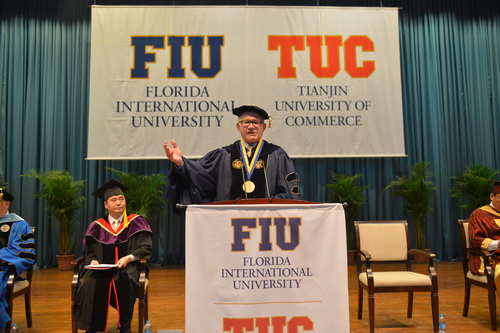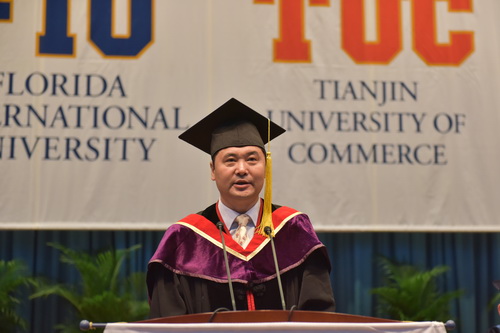 孙钰首先代表天津市人大常委会原副主任、中国外商企业投资协会副会长王述祖先生致辞,对全体毕业生表示祝贺。她表示, FIU 与beat365英国官方网站的合作已成为提高中国人才培养质量的成功典范,为发达国家与发展中国家高等教育的良好合作树立了标杆,也相信毕业生会成为中国乃至世界旅游和酒店业发展的栋梁人才。