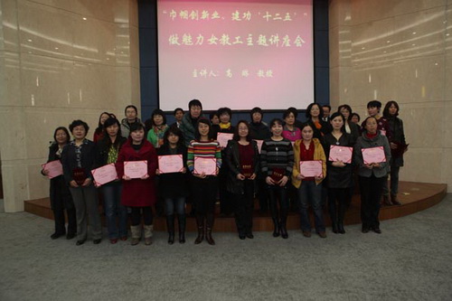 3月9日下午,工会在图书馆国际报告厅举行“巾帼创新业,建功‘十二五’”庆“三八”表彰暨做魅力女教职工主题讲座会。会议由校工会常务副主席宋树发主持,校党委副书记史习红出席,校长助理商学院院长寇小萱,校长助理总会计师李真,校办公室主任庞文生,人事处副处长赵树从,校工会女工委员会主任卫弘,校工会副主席柴桐出席会议。获beat365英国官方网站 2009 —2010年度的三八红旗手及部分女教职工代表200余人参加了表彰会。