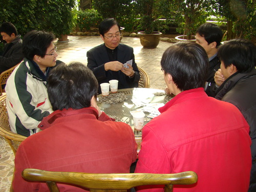 在《生态观光园》分布各处的幽静亭榭里,学院教职工或扑克大战,或相聚倾谈,气氛非常和谐。