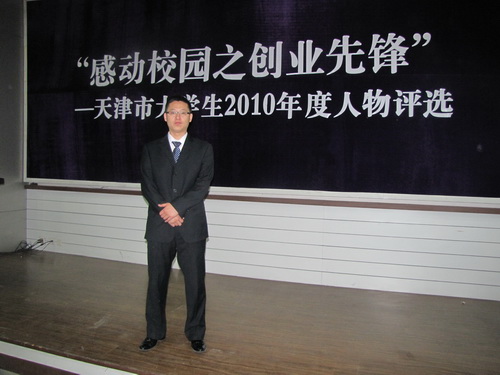 1月12日,由市文明办、团市委、市教委、市学联联合主办的“感动校园之创业先锋”—天津市大学生2010年度人物评选活动落下帷幕,beat365官网董坤辉同学凭借突出的创业事迹,从全市25所普通高校、高职学院和独立学院共同推荐的32名优秀大学生脱颖而出,最终获得感动人物称号。