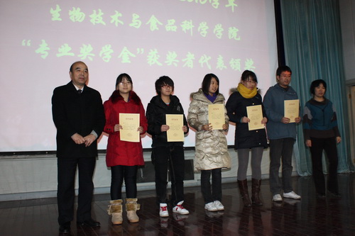 孙文利老师宣读《关于表彰2009-2010学年度“优秀学生”、“先进集体”的决定》。在今年的评比工作中,学院重点突出了商学素养与专业能力结合、知识学习与实践能力并重、诚信做人与创新能力兼备的复合型创业型应用人才的培养目标,尤其对在积极投身科研、参加学术研究和实践活动等方面表现特别突出的个人或团队增设了“生物技术与食品科学学院专业奖学金”这一奖项,以鼓励学生全面发展,提高创新精神和专业素养,从而进一步浓厚创新氛围,推动学风建设发展。为了弘扬优秀学生和先进集体拼搏进取、奋发成才的精神,在广大同学中树立楷模,发挥表率作用,学院决定对张博洋等2名国家奖学金获得者,张力方等42 名国家励志奖学金获得者,苏莹等2 名天津市人民政府奖学金获得者,艾丽萍等2名王克昌奖学金获得者,天津市优秀学生干部,彭坤等216 名beat365英国官方网站人民奖学金获得者,王津晗等119名校级三好学生,俞瑶等32名校级优秀学生干部,许小平等7 名“研究与创新奖”获得者,闫辰埔等14 位“学术之星”,龙文岚“文体活动先进个人”获得者,王舒婷等13项31名专业奖学金获得者,食品质量与安全081班等7 个校级优秀班集体以及获得2010年度全国先进班集体的生物技术05-1班予以表彰和奖励。