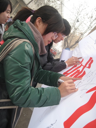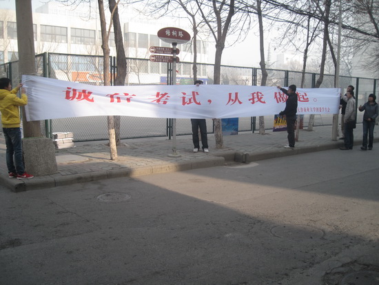 工作人员在活动现场拉出了写有诚信考试倡议宣言的横幅, 倡导同学们在即将到来的期末考试中诚信应考,杜绝舞弊现象,共树校园诚信风气,营造诚实守信的道德风尚。 同学们积极踊跃地在横幅上签名,并表示一定会努力学习,提高实力,诚信应考,凭真实水平取得满意成绩。为进一步加大“诚信考试”活动倡议力度与广度,校学生会同时于校园网上发布《诚信考试倡议书》,倡议广大同学诚信应考,诚信做人。